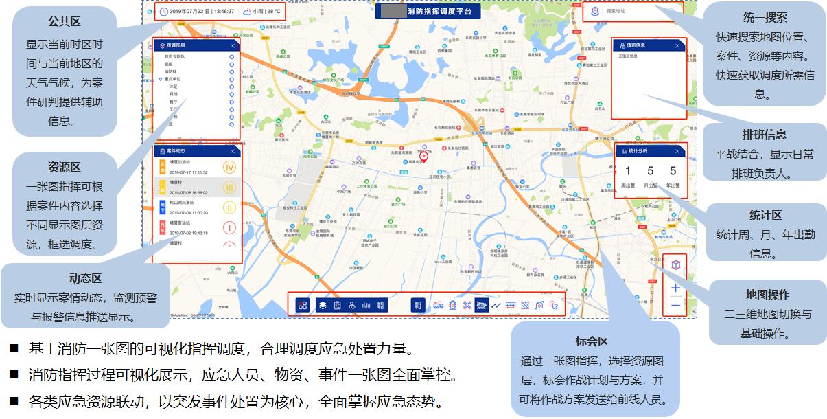 以計(jì)算機網絡技術(shù)、通訊技術(shù)、地(dì)理(lǐ)信息技術(shù)、大(dà)數據、雲計(jì)算、融合通信應用(yòng)爲支撐,建立基于二三位地(dì)圖一體化的(de)快速接出警、協同指揮聯動救援、智能(néng)化消防作戰指揮平台,實現應急救援指揮爲一體的(de)消防可(kě)視化綜合作戰指揮平台!